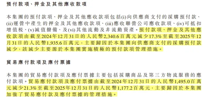 如果进一步看资产负债表里的细项,这种改善其实更清楚。首先,预付款项、押金及其他应收款项从 2024 年末的 23.41 亿元降至 2025 年末的 19.36 亿元,同比下降 17.3%,公司在年报中明确解释,主要是因为向供应商支付的采购预付款减少,背后反映的是其对预付款项管理更积极。
