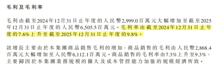 2025年,鸣鸣很忙的毛利率提升至9.8%,较2024年的7.6%提升了2.2%。