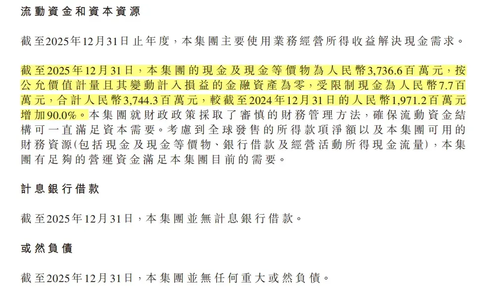 从财务上看,到 2025 年末,公司现金及现金等价物为 37.37 亿元,连同受限制现金合计 37.44 亿元,同比增长约 90%;资产负债率从 43.7% 降至 35.8%;截至年末没有计息银行借款。