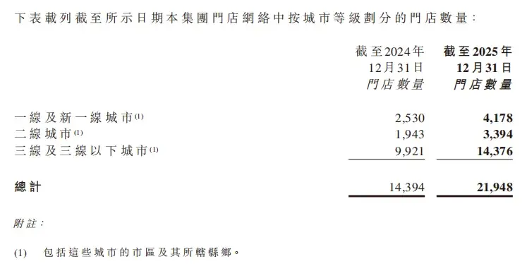 从门店分布来看,截至 2025 年末,公司门店达到 21,948 家,覆盖全国 30 个省份和所有城市等级,其中约 60% 位于县城及乡镇,覆盖 1,401 个县,对全国县城覆盖率约 75%。